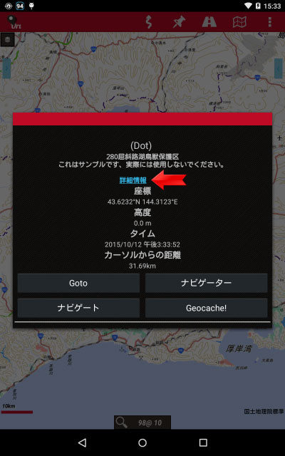 Oruxmaps を起動し、地図マークをタップします。![]() 「ロードKMLオーバーレイ」をタップします。 ![]() 表示させたいファイル名をタップします。 ![]() 鳥獣保護区等位置図が表示されました。 区域の周りに、黒字があって見にくい場合は消します。 地図マークをタップします。 ![]() Map settings をタップします。 ![]() KML overlay settings をタップします。 ![]() オーバーレイパス・テキストのチェックを外します。 最下部、「戻るボタン」を何度かタップし、戻ります。 ![]() 黒字が消え、戻りました。 屈斜路湖にある島が鳥獣保護区なので、タップしてみます。 ![]() 鳥獣保護区名が表示されました。 「詳細情報」をタップしてみます。 ![]() とりあえず、「1回のみ」 ![]() ネットワークに接続されていると、ブラウザにて詳細情報が表示されます。 戻ります。 ![]() 戻ったので、再度地図マークをタップします。 ![]() 「削除KMLオーバーレイ」をタップします。 ![]() 鳥獣保護区等位置図が消えました。 (画面表示が消えますが、鳥獣保護区等位置図データは残っています) ![]() |